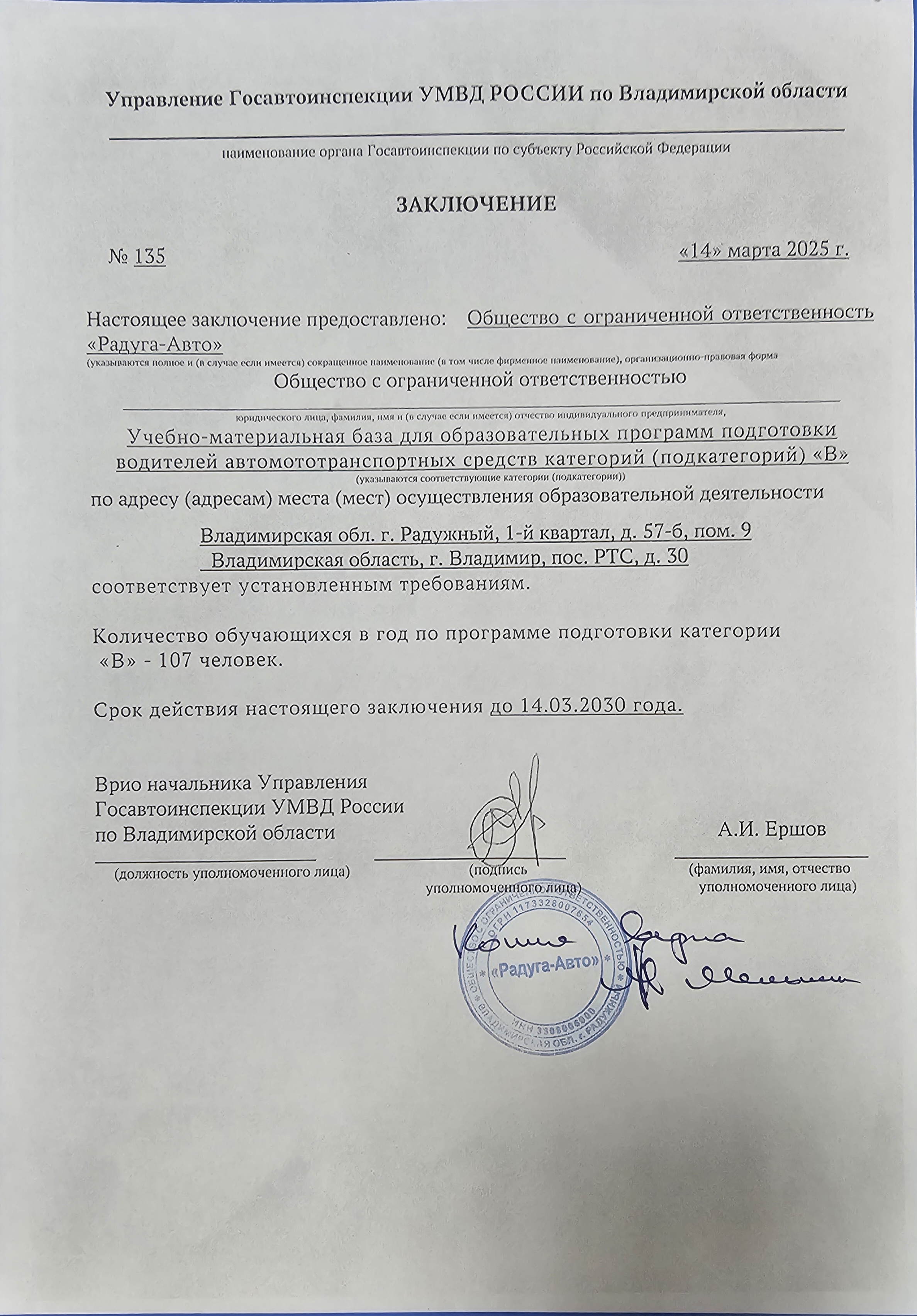 Заключение Госавтоинспекции о соответствии установленным требованиям