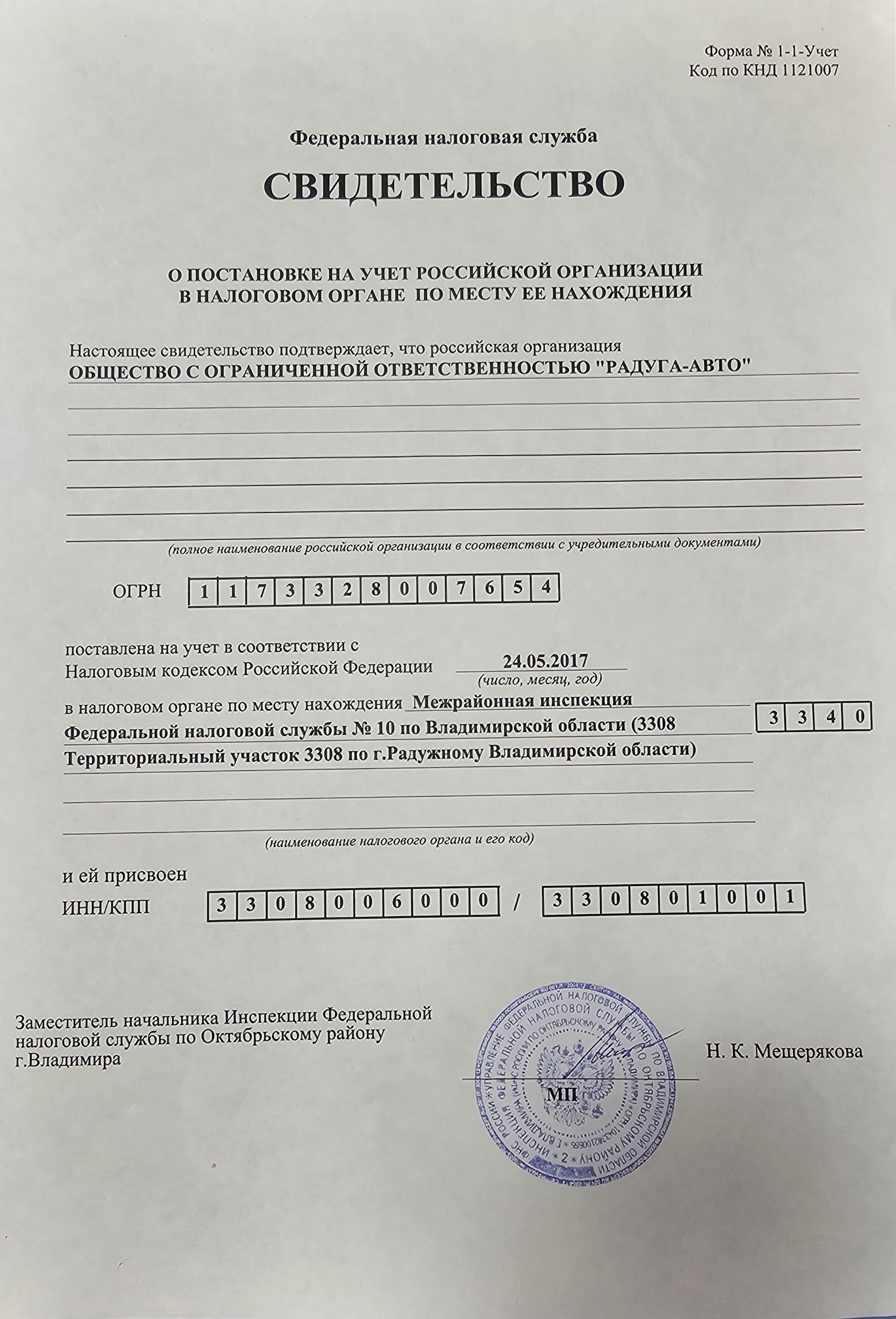 Свидетельство о постановке на учет российской организации в налоговом органе